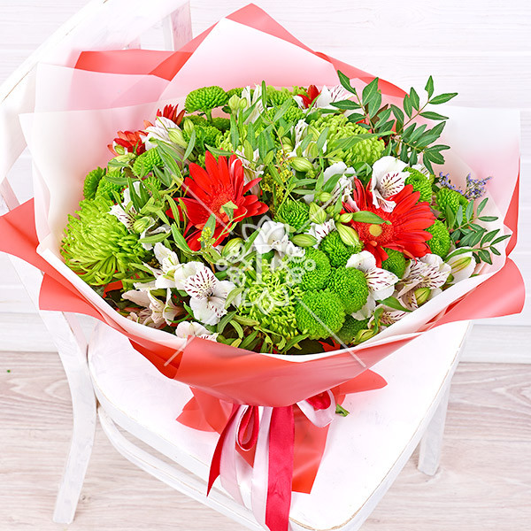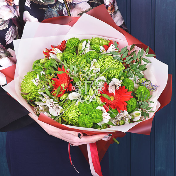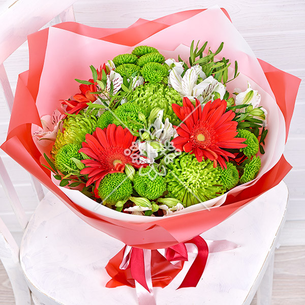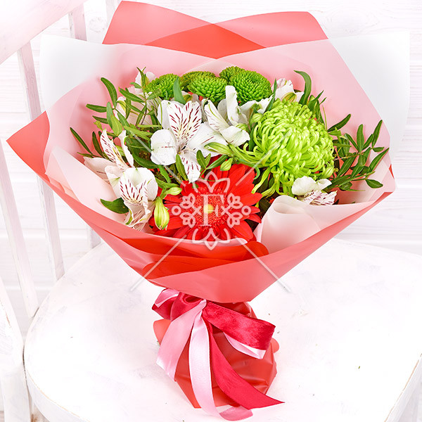 гербера красная – 1 шт., хризантема зеленая одноголовая – 1 шт., хризантема зеленая кустовая – 1 шт., альстромерия белая – 2 шт., зелень декоративная (фисташка), упаковка, лента.