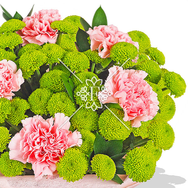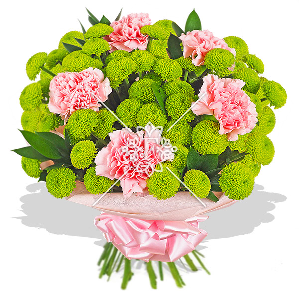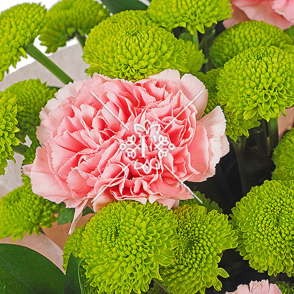 В составе розовые гвоздики и кустовая зеленая хризантема сантини. Помимо того, что эти цветы хорошо и долго стоят в вазе, они также не имеют яркого аромата. Очень красивое сочетание зеленого и розового оттенка, выглядит свежо и романтично.